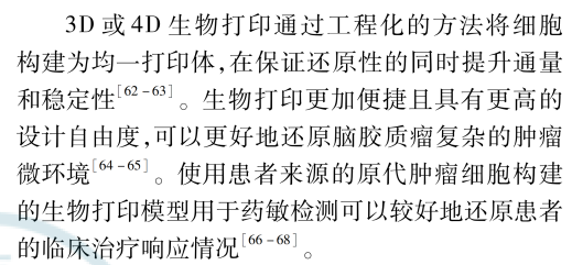 - 医工交叉:3D或4D生物打印通过工程化的方法将细胞构建为均一打印体,在保证还原性的同时提升通量和稳定性。生物打印更加便捷且具有更高的设计自由度,可以更好地还原脑胶质瘤复杂的肿瘤微环境。使用患者来源的原代肿瘤细胞构建的生物打印模型用于药敏检测可以较好地还原患者的临床治疗响应情况。
