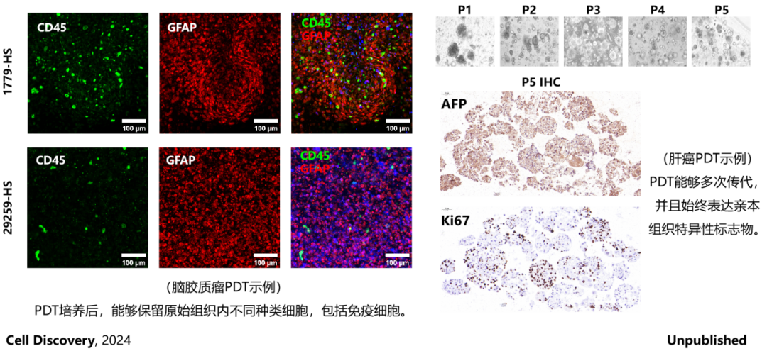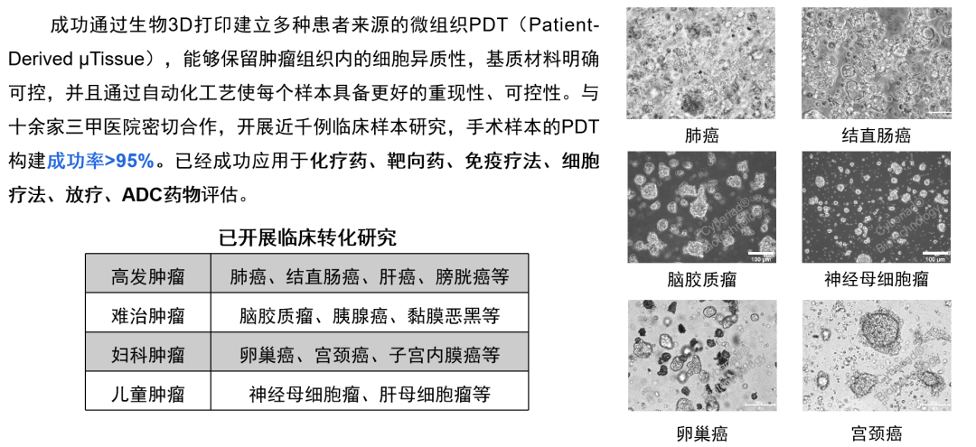 在肿瘤领域,赛箔生物与临床合作者共同研发基于生物3D打印技术与生物材料的肿瘤微组织(PDT),包括高发肿瘤、难治肿瘤、妇科肿瘤和儿童肿瘤四大类,涵盖肺癌、肠癌、脑胶质瘤、胰腺癌、卵巢癌、子宫内膜癌、宫颈癌、神经母细胞瘤、肝母细胞瘤等实体瘤。通过逾千例样本研究,充分证实了PDT与患者组织具有高度一致的分子特征和药物敏感性,为肿瘤药物筛选提供了丰富多样且精准的实验模型。