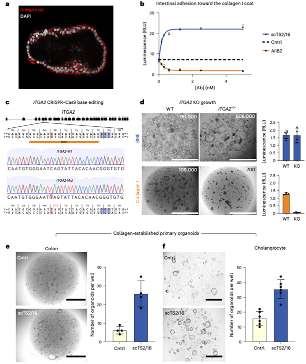 胶原 I 是临床常用的 ECM 材料(已用于组织修复),但单独使用时类器官生长效率极低。scTS2/16 通过激活 α2β1 整合素(胶原 I 受体),增强胶原黏附与生长:结肠类器官单细胞在胶原 I 上的黏附量,在 scTS2/16 作用下从 7.5×10⁵ RLU 提升至 22.5×10⁵ RLU。CRISPR 敲除 α2 整合素(ITGA2⁻/⁻)后,类器官无法在胶原中生长,证实 α2β1 整合素是关键。支持原代类器官培养:新鲜结肠活检组织在胶原 I+scTS2/16 中,类器官产量从平均 6 个 / 孔提升至 25 个 孔。胆管原代类器官产量提升 2 倍。