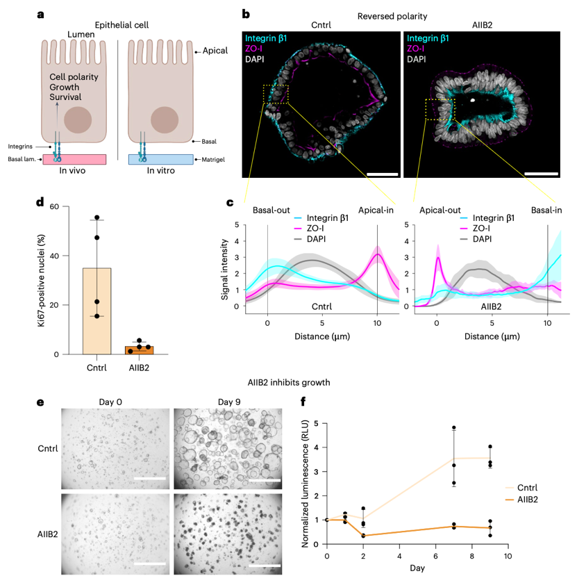 研究团队发现,类器官与 ECM 的相互作用核心依赖 β1 整合素 —— 抑制 β1 整合素(如使用抗体 AIIB2)会导致类器官极性反转、生长停滞,这提示:若能激活 β1 整合素功能,或可摆脱对 Matrigel 的依赖,改用成分明确的临床级 ECM 材料(如胶原 I)培养类器官。