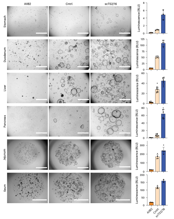 scTS2/16 通过变构作用激活 β1 整合素,增强类器官与 ECM 的相互作用。提升细胞黏附能力:结肠类器官单细胞在 Matrigel 上的黏附量,在 2nM scTS2/16 作用下从 11×10⁵ RLU 提升至 22×10⁵ RLU,而抑制性抗体 AIIB2 会完全阻断黏附。促进类器官增殖与克隆形成:添加 5nM scTS2/16 后,结肠类器官 10 天内基因组 DNA 量提升 3 倍,单细胞克隆形成效率从 30×10³ RLU 提升至 330×10³ RLU。适用多种胃肠道类器官:胃、十二指肠、空肠、回肠、胰腺导管、胆管类器官在 scTS2/16 作用下,生长均显著提升,其中胰腺类器官产量提升 8.1 倍。