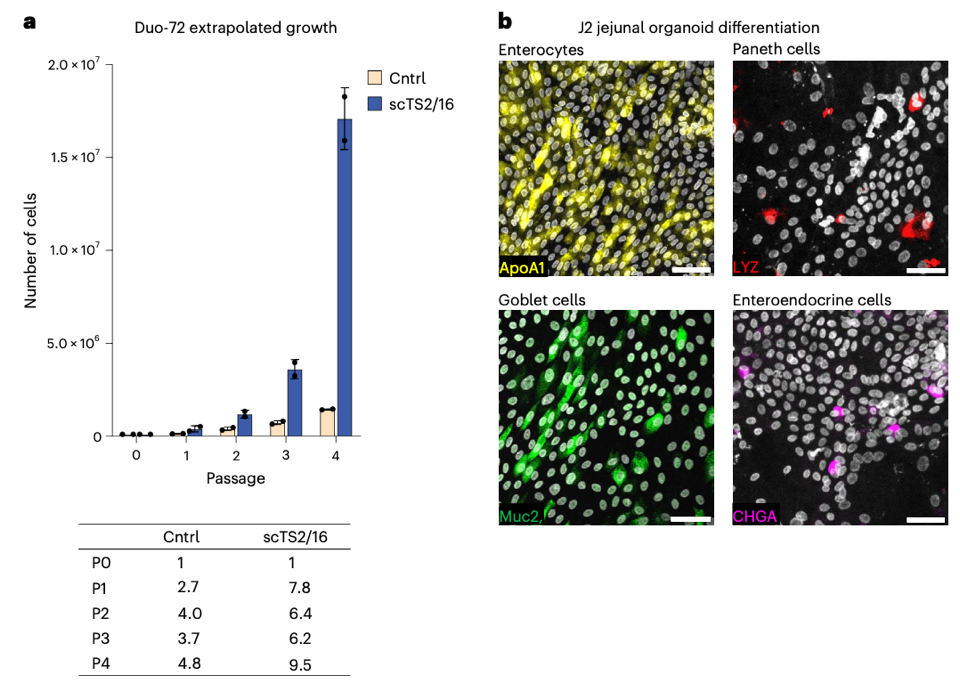 兼容 2D 长期培养:十二指肠类器官在胶原 I 包被的 Transwell 中,添加 scTS2/16 后连续传代 4 次,细胞总量提升 15 倍。空肠类器官传代 6 次后,仍能分化为肠上皮细胞、杯状细胞、潘氏细胞和肠内分泌细胞。