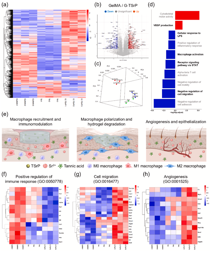 与单独 GelMA 和 TA 处理相比,G-TSrP 组巨噬细胞中 517 个基因显著上调,245 个基因显著下调,主要富集于 “免疫反应调控”“细胞迁移” 和 “血管生成” 相关通路。