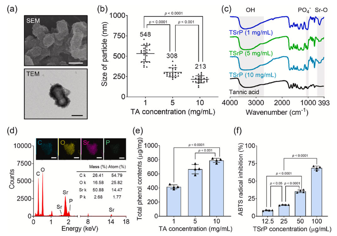 结构与成分可控:SEM 和 TEM 显示 TSrP 为凸起球形结构,TA 浓度 1mg/mL 时平均粒径 548nm,随着 TA 浓度升高粒径减小.