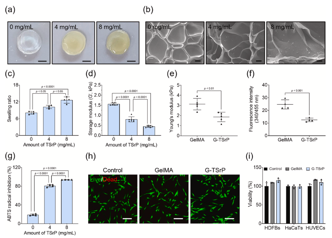 将 TSrP 嵌入 GelMA 水凝胶,通过光交联形成 G-TSrP 复合水凝胶,兼顾生物相容性与功能稳定性: