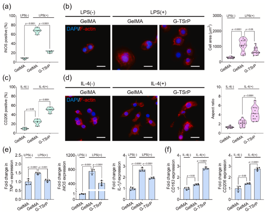 促进 M2 型极化:IL-4 诱导条件下,G-TSrP 提取物显著提升 CD206 阳性细胞比例,增强 CD163、CD206 等修复相关基因表达,且效果优于单独 TA 处理(Figure 5c-d,f);