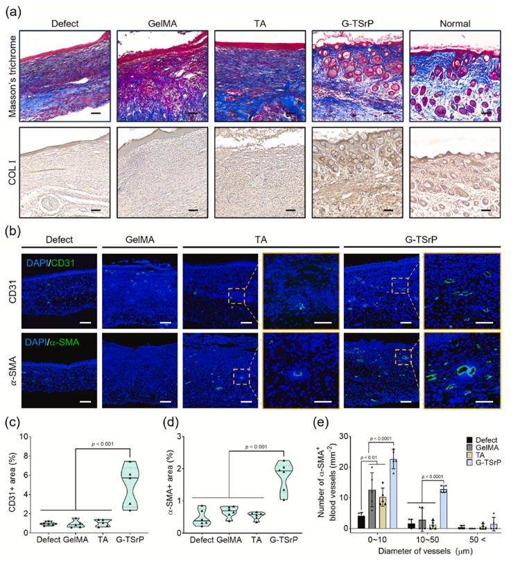 增强血管新生与胶原沉积:CD31 和 α-SMA 免疫荧光显示,G-TSrP 组血管数量和成熟度显著提升,直径>10μm 的小动脉数量明显增加;Masson 三色染色和胶原定量证实,新生组织中胶原 I 沉积致密,接近正常皮肤结构。
