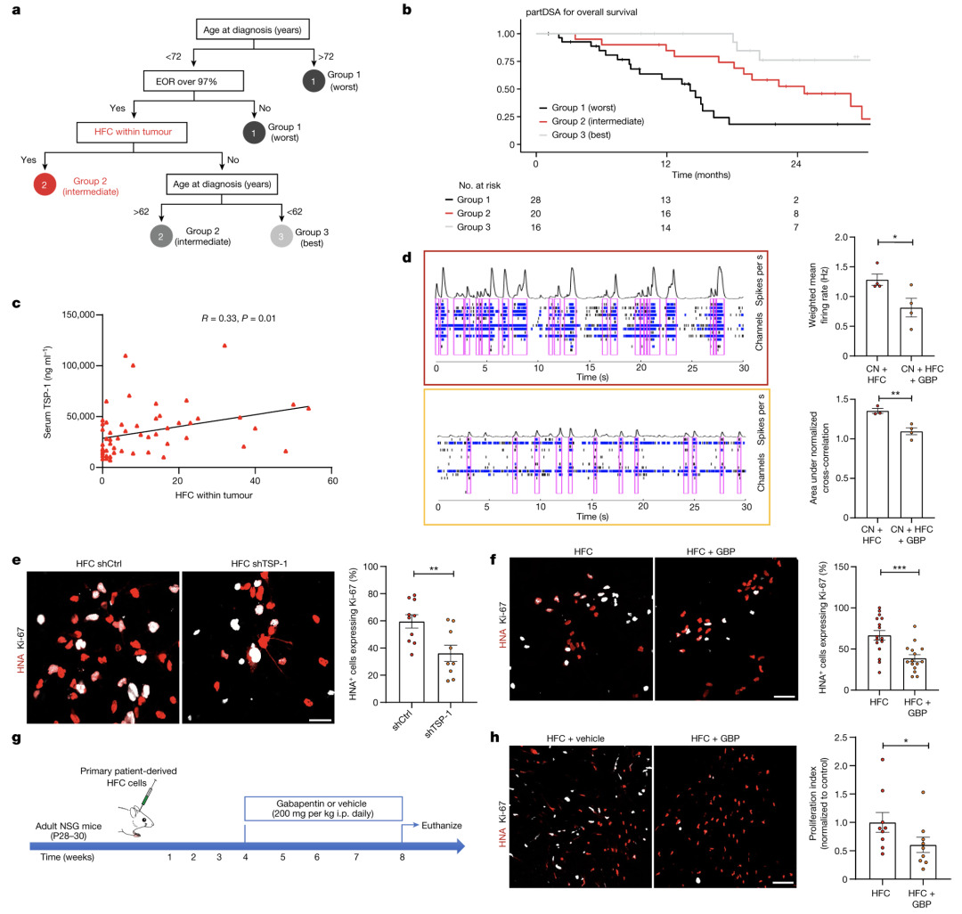 鉴于加巴喷丁(GBP)作用于TSP-1受体α2δ-1 的调节剂,作者进一步研究GBP对神经元活动驱动胶质瘤生长的影响。在神经胶质瘤与神经元共培养中,GBP处理的共培养体系中,细胞的突发活动和同步网络突发显著减少。在使用shRNA逆转THBS1或使用GBP治疗的主要患者来源的HFC细胞GBP,不影响其单独生长的增殖培养,证实GBP没有肿瘤细胞的内在影响。相比之下,遗传或药物靶向TSP-1能够显著减少与神经元共培养的HFC胶质瘤细胞增殖。在HFC患者来源异种移植小鼠模型中,GBP处理导致胶质瘤增殖Ki67显著降低。结果提供了GBP作为治疗TSP-1调节的胶质瘤发展的潜在策略的初步证据。