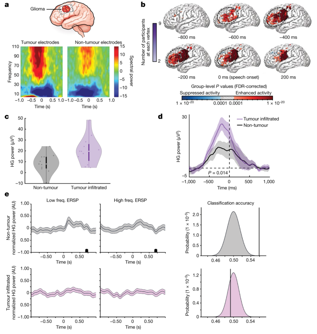 胶质母细胞瘤和其他高级胶质瘤与中枢神经系统之间的相互作用会引起神经元和神经网络的变化。为了研究胶质母细胞瘤浸润大脑皮层时与认知任务相关的特异性神经元的活动,作者选择在外侧前额皮质(LPFC)有肿瘤的成年患者,将皮质电图(ECoG)电极置于肿瘤浸润和外观正常的皮质上,在70-110 Hz之间的ECoG信号显示了肿瘤电极和非肿瘤电极之间明显的频率分离。作者对电极阵列的肿瘤浸润皮层进行记录,发现肿瘤会重塑浸润的皮质区域包括通常不涉及语言产生的皮质区域。
