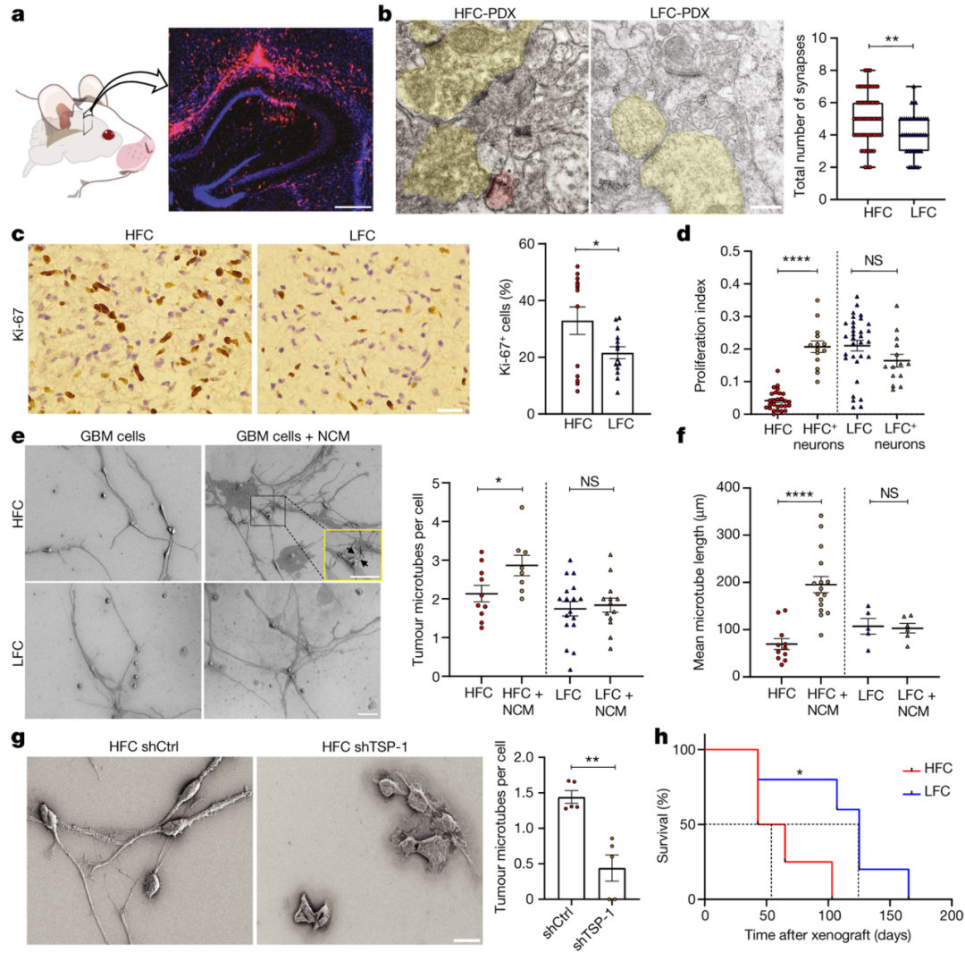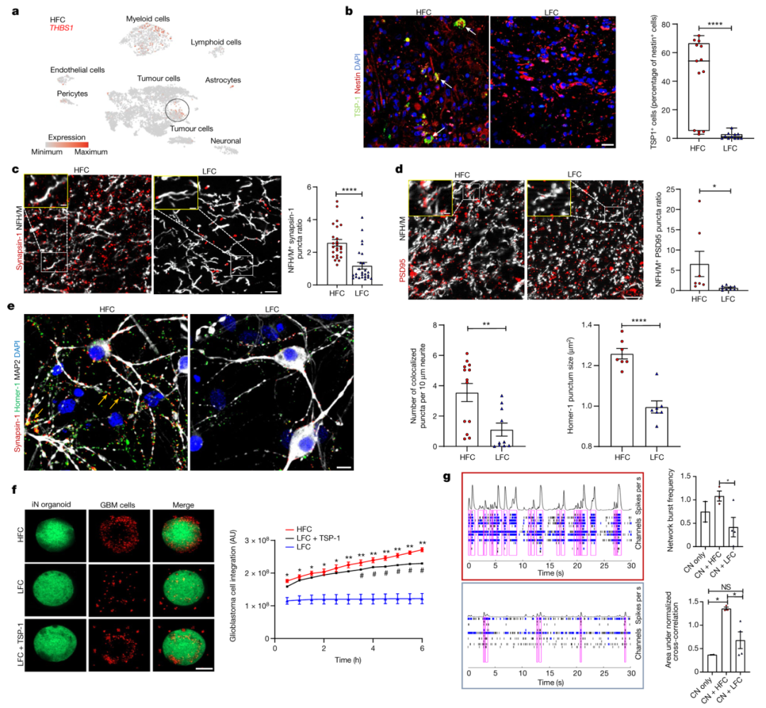 胶质瘤表现出肿瘤内的异质性,同时肿瘤细胞亚群扮演着特殊的角色。上述来自人类的数据表明正常脑回路的胶质母细胞瘤中功能整合的局部异质性,并提示在HFC的肿瘤内区域存在肿瘤亚群突触连接的发生。作者进一步检测高表达THBS1的HFC胶质瘤细胞浸润小鼠脑中的突触表达。将RFP标记的HFC或LFC胶质瘤细胞进行立体定向异种移植进入小鼠海马CA1区,经过一段时间后植入和生长,免疫电镜分析确定了在HFC胶质瘤异种移植组中,突触数量(神经元到神经元和神经元到胶质瘤)明显高于异种LFC胶质瘤移植,证实HFC区域的胶质瘤细胞具有更大的突触潜力。