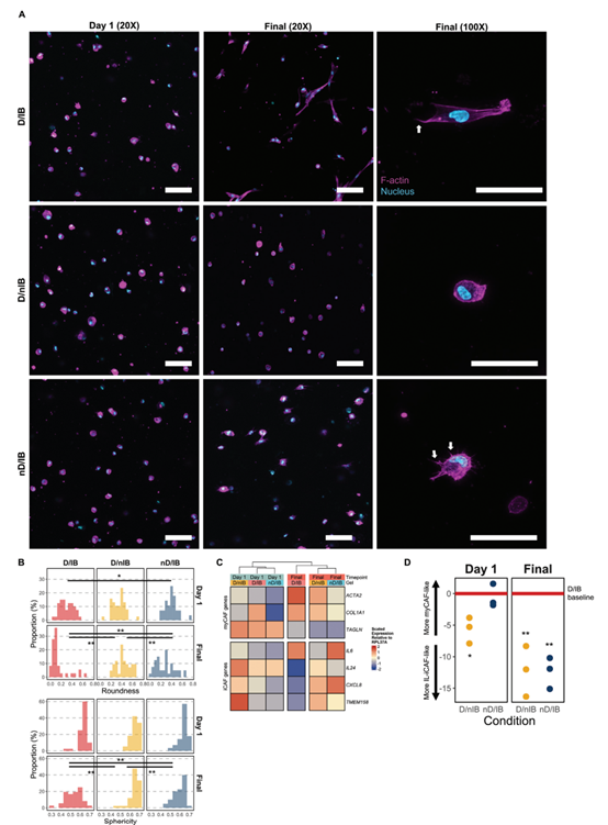 最后,作者使用源自 scRNAseq 的差异表达基因集进行基因富集分析,以计算培养的 CAF 和体内 CAF 亚群之间的相关性评分。允许 CAF 扩散 的D/IB水凝胶组诱导了强烈的 myCAF 表型,而不可降解的 nD/IB水凝胶则诱导了的树突状和球形是 IL-iCAF 表型。相比之下,D/nIB 中的圆形和球形 CAF 既不是 CAF 亚群特异性的,也不是 myCAF 或 IL-iCAF 样的。