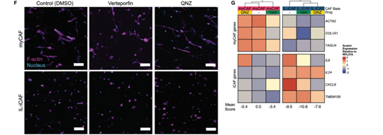 接下来,作者探究了是否可以在这些培养物中使用特定的转录因子抑制药物来靶向CAF亚群,维替泊芬靶向YAP / TEAD、QNZ靶向NF-κB。对维替泊芬或QNZ处理的培养物的形态学分析显示,维替泊芬诱导体外myCAF群体变得更圆和更偏向球形。这与体外 myCAF 中 myCAF 相关基因表达的下降趋势有关 。