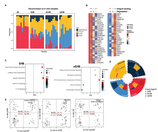 在基因层面,与D/nIB水凝胶组相比,nD/IB水凝胶组的CAF具有更高的IL-iCAF相关基因表达,更有利于IL-iCAF的产生。与体内对应物相比,这些体外CAF中也富集了相似的生物学途径:如D/IB水凝胶中CAF的肌动球蛋白结构组织,以及nD / IB水凝胶中CAF的白细胞介素信号传导。
