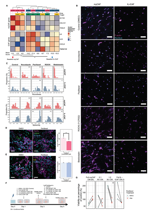 综上所述,这些结果表明,紫杉醇和多西紫杉醇的益处可以部分地通过诱导myCAF中更多的IL-ICAF样状态来实现,但前提是首先存在一些IL-iCAF。因此,这些发现强调了微管动力学可能在从myCAF向IL-iCAF转变的过程中发挥重要作用;靶向微管可能会使myCAF/IL-iCAF中等丰度的患者受益。