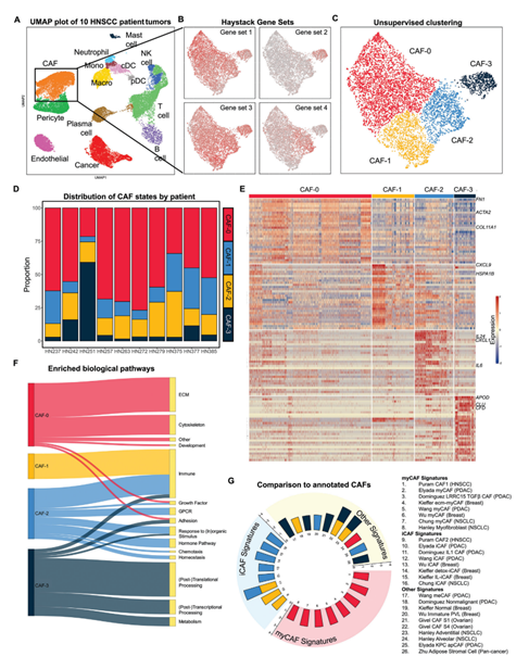 作者对10 例头颈部鳞状细胞癌患者肿瘤进行单细胞测序,利用成纤维标志物从数据集中鉴定出成纤维细胞,并进一步根据CAF 在2D UMAP 空间中表达不同的基因集确定了四种亚簇,并在所有患者中验证了四个亚簇的存在。基因富集分析发现0簇CAF与ECM 和细胞骨架通路相关,这个特征常见于 myCAF。1-3簇CAF显示出免疫相关通路相关,其中1簇CAF和2簇CAF分别与 IFN(干扰素) 和 IL(白介素) 信号传导相关,而补体通路在3簇CAF中被激活。此外,3簇CAF 与代谢、RNA 和蛋白质加工途径相关。但与其他研究比较,3簇CAF 上调 CD74,但不上调 apCAF特征基因。与先前被描述为 myCAF 祖细胞的脂肪基质细胞 (ASC) 最相似。因此,基于这些分析,作者将0-3簇CAF 分别称为 myCAF、IFN-iCAF、IL-iCAF 和脂肪样 CAF (adipoCAF)。