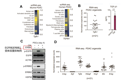 TGF-β在体外和体内的PDAC恶性细胞中均有表达。并且,作者之前的研究表明,PDAC类器官条件培养基( CM )激活PSCs中TGF-β通路的下游成员SMAD2,并且在CM处理的PSCs中抑制TGF-β信号增强了iCAF表型。因此,在证实PDAC类器官分泌TGF-β后,作者评估了PDAC类器官CM是否激活PSCs中的EGFR / ERBB2信号