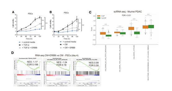 为了进一步了解EGFR / ERBB2激活对myCAFs的影响,作者首先检测了在EGFR和/或EGFR / ERBB2抑制剂存在的情况下,TGF-β或PDAC类器官CM处理后PSCs的增殖情况。在EGFRi和/或ERBBi的即刻或延迟(72小时)暴露后,PSC的增殖显著降低,而没有检测到凋亡的增加,表明EGFR / ERBB2信号传导介导了TGF-β诱导的myCAFs 的增殖。这与Egfr或ERBB2敲除后PSCs的TGF-β依赖性增殖减少相一致。根据文献调研得到PDAC CAFs以不同状态共存。