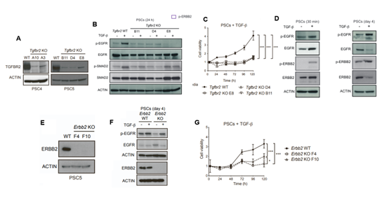 作者敲除了PSCs中TGF-β受体Ⅱ( TGF-ΒR2 )发现,TGF-ΒR2的缺失会阻断TGF-β应答基因的诱导、TGF-β依赖的增殖和EGFR 的激活。这表明TGF-β通过其同源受体TGF-ΒR2激活EGFR。同样,作者在敲除了ERBB2后,发现PSCs中ERBB2缺失导致TGF β依赖的EGFR活化受损,表明EGFR和ERBB2协同激活下游信号。