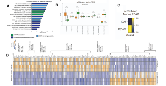 该团队在之前的研究中发现白细胞介素1 (IL-1)和转化生长因子β (TGF-β)分别是诱导iCAF和myCAF形成的主要恶性细胞源性配体。虽然对IL-1信号下游通路的了解已经揭示了iCAF的治疗靶点,但TGF-β诱导的myCAFs中活跃的通路在很大程度上是未知的。因此,该团体对TGF-β 诱导的 myCAF 中活跃的通路进行了研究。