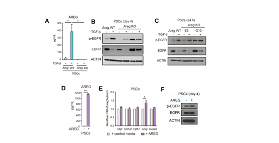 RT-qPCR 分析证实TGF-β诱导的Areg和Hbegf在PSCs中的表达被TGF-βr2的敲除( KO )或TGF-ΒR1抑制剂( TGF-ΒR1i ) 处理所阻断。此外,在基因敲除或药物抑制Egfr或ERBB2后,仅观察到Areg和Hbegf表达的部分缺失,验证了Areg和Hbegf是TGF-β诱导的体外的myCAFs中EGFR激活的候选介质。然而,Areg是TGF-β和PDAC类器官CM处理均显著诱导的唯一EGFR / ERBB2配体