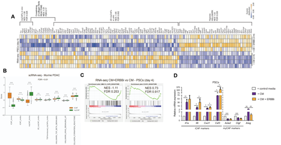 因此,作者设定在体外评估myCAFs和iCAFs同时存在时EGFR / ERBB2抑制对CAF组成的影响,以更接近体内情况。为此,作者在有或没有ERBBi的情况下用PDAC类器官CM培养PSCs,因为CM处理不仅激活TGF-β信号,而且诱导IL - 1信号和iCAF标记物的表达。结果显示,已知的iCAF相关信号,包括JAK/STAT信号通路,NF - kB信号和体内iCAF信号,没有被EGFR / ERBB2抑制剂显著改变。