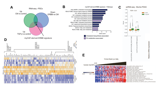 为了更好地表征EGFR / ERBB2激活的CAFs,作者对有或没有ERBBi存在的CM处理的PSCs进行了RNA - seq。通过将TGF-β和CM诱导的基因与EGFR / ERBB2抑制下调的基因相交,作者定义了一个52个基因的体外myCAF来源的标记。经CM处理的PSCs上调KRAS信号和Dusp6表达,这些效应可被ERBBi阻断,而不显著改变TGF-β信号激活,此外,胆固醇生物合成相关的信号通路是myCAFs来源的ERBB信号通路中最显著富集的通路之一,并且myCAFs来源的ERBB信号通路和胆固醇生物合成信号通路在体内myCAFs中均上调。最后,作者为了进一步验证发现,在TCGA 的 PDAC数据集( PAAD )的基因集变异分析中鉴定了人类myCAF标记,myCAF相关的TGF-β和Hedgehog ( HH )基因标记,与EGFR和ERK信号之间存在显著的正相关性。因此,这些数据支持PDAC恶性细胞分泌的TGF-β在小鼠和人PDAC的myCAFs中激活EGFR信号传导的模型。