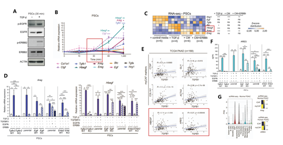 为了研究EGFR激活在TGF-β诱导的myCAFs中如何持续存在,作者在有或无ERBBi的情况下,用TGF-β或PDAC类器官CM培养的PSCs的RNA - seq图谱中寻找已知的EGFR / ERBB2配体的表达。这些RNA - seq图谱鉴定了EGFR / ERBB2配体,包括双调蛋白( Areg )和肝素结合型表皮生长因子样生长因子( Hbegf ),显著受TGF-β诱导