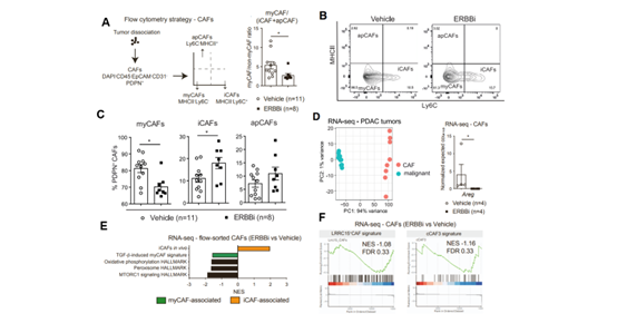为了评估体内EGFR / ERBB2抑制是否对不同的CAFs亚群产生不同的影响,作者利用流式细胞术定量检测Ly6C MHCⅡ- myCAFs,Ly6C + MHCⅡiCAFs和LY6C MHCⅡ+ apCAFs6 。ERBBi处理后,apCAFs无明显变化,myCAFs减少,iCAFs增加,显著改变了PDAC肿瘤中myCAF / non - myCAF的比值。