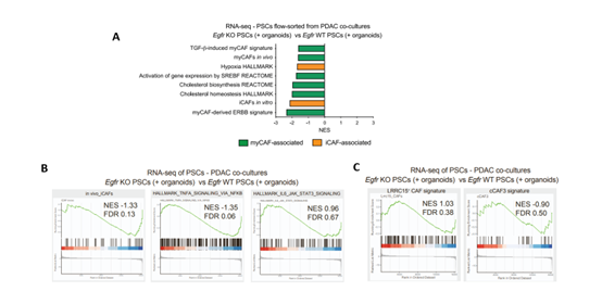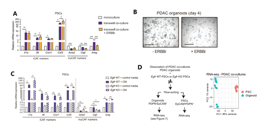 为了分析更接近体内情况的模型,作者建立了PDAC类器官与Egfr WT或Egfr KO PSCs的共培养。然后通过RNA - seq 对流式分选的恶性细胞和PSC群体进行分析。