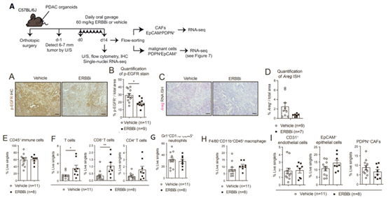 为了确定EGFR / ERBB2信号抑制在体内是否对不同的CAF亚型产生不同的影响,作者建立了PDAC类器官原位移植小鼠模型,并用EGFR / ERBB2抑制剂( ERBBi )诺拉替尼处理荷瘤小鼠2周。EGFR通路的有效靶向是通过下调p - EGFR和Areg水平以及增加T细胞和CD8 + T细胞丰度来证实的。