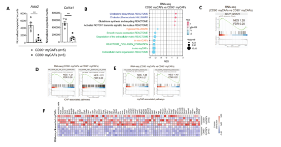 此外,CD90 -myCAFs显著富集于胆固醇生物合成相关的信号通路,在TGF-β诱导的myCAF和myCAF来源的ERBB信号通路中上调。CD90 + myCAFs显著下调了已知的体内iCAF和myCAF特征,证实了它们与CD90 + myCAFs或其他先前描述的myCAF亚型的表型差异,包括TGF-β依赖的LRRC15 + myCAF。