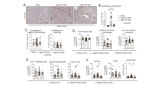 此外,直接的细胞-细胞群体效应在治疗研究中具有挑战性,在治疗研究中,多个群体可以直接和/或间接地受到治疗的影响。因此,为了研究EGFR激活的myCAFs在PDAC进展中的潜在直接作用,作者建立了PDAC类器官单独或与Egfr WT (即Rosa26 KO)或Egfr KO PSCs共注射的原位移植小鼠模型。通过免疫组化( IHC )检测与SV40 large T抗原永生化的共移植PSCs,证实了EGFR信号在促进CAF增殖中的作用,如在体外中观察到的那样。与ERBBi和载体处理的PDAC肿瘤相似,巨噬细胞和中性粒细胞浸润、胶原沉积和α SMA水平在队列中没有显著差异。流式细胞术分析显示,与PDAC + Egfr WT PSC肿瘤相比,PDAC + Egfr KO PSC肿瘤中CAF总丰度降低。然而,这种CAFs的减少并不与不同的CAF亚群无关,因为与PDAC + Egfr WT PSC肿瘤相比,只有myCAFs在PDAC + Egfr KO PSC肿瘤中显著下调,改变了myCAF / iCAF的比值。