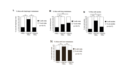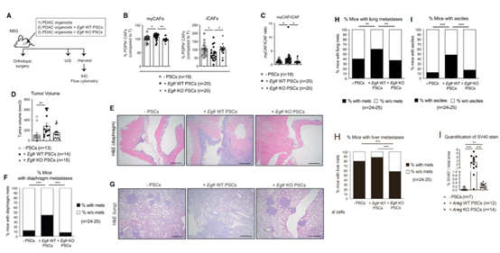最后,PSCs中Areg的缺失破坏了横膈转移灶、肝转移灶和腹水的形成,但对肺转移灶没有影响,进一步凸显了CAF介导的PDAC转移过程的复杂性。
