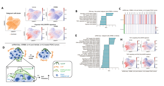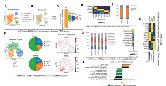 为了验证他们的发现,并进一步研究EGFR / ERBB2抑制后CAF群体的变化,作者用ERBBi或载体处理2周的PDAC肿瘤进行了单核RNA测序。Dusp6表达的下调证实了该通路在多种细胞类型中的靶向性,差异表达基因的分析确定了上皮细胞和CAFs是EGFR / ERBB2抑制后最受影响的细胞群体。值得注意的是,与载体处理的肿瘤相比,iCAF丰度和iCAF相关的标记在ERBBi处理的PDAC肿瘤中富集,而myCAF丰度和myCAF相关的标记下调。
