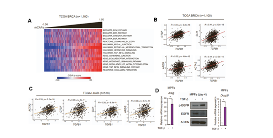 此外,与作者在TCGA PAAD数据集中发现的结果类似,对TCGA BRCA和肺癌LUAD数据集的分析显示,TGF-Β1的表达与AREG的表达以及myCAF标记物的表达呈正相关。最后,TGF-β处理诱导小鼠肺成纤维细胞中Areg和Dusp6表达并激活EGFR信号。总的来说,这些分析表明EGFR的激活也发生在其他恶性肿瘤的TGF-β依赖的myCAF群体中,并且可以直接受到EGFR / ERBB2靶向策略的影响。