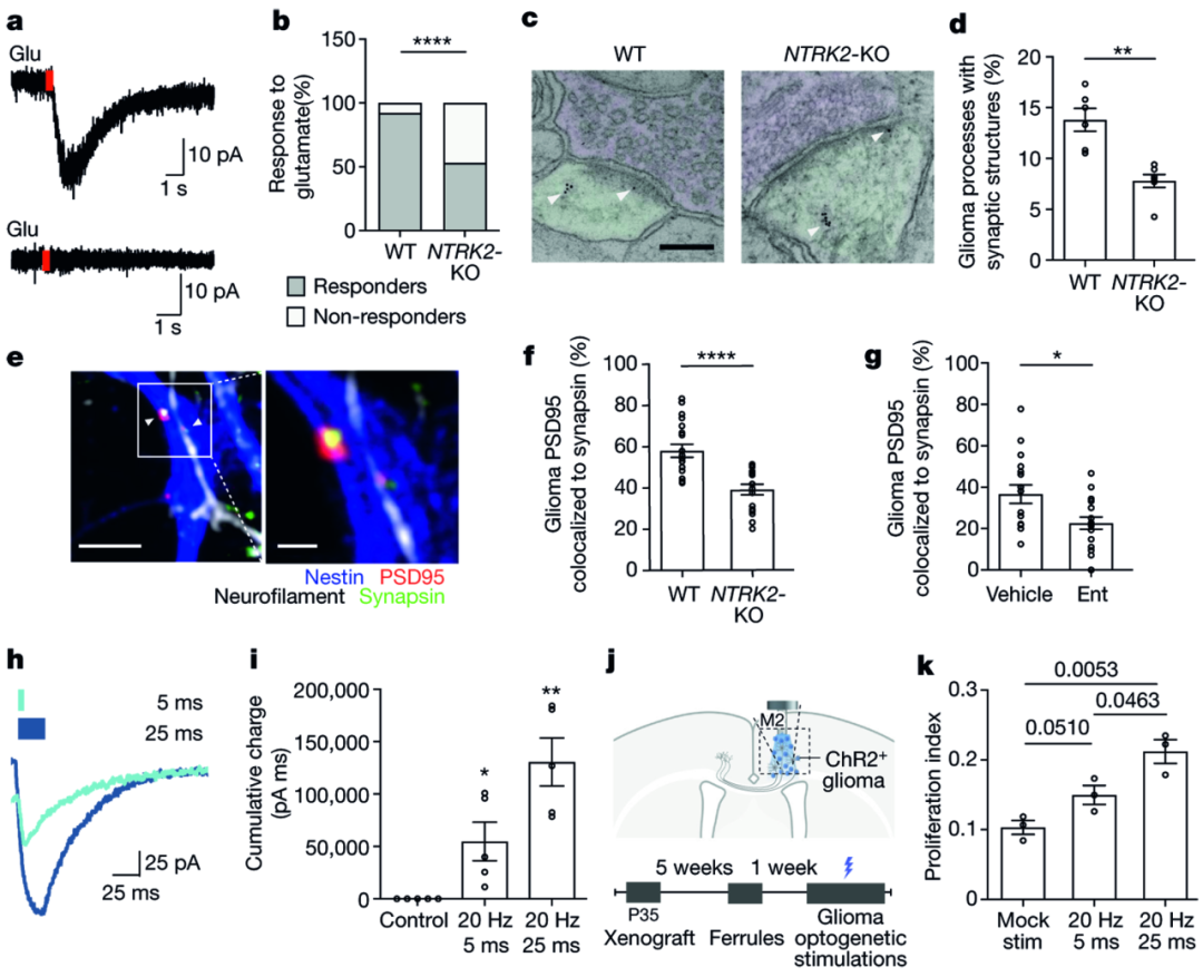 最后,为了验证神经胶质瘤细胞NTRK2的缺失是否会改变恶性突触链接的程度,作者利用膜片钳观察与其他异种移植的胶质瘤细胞在谷氨酸存在时表现出对内向电流的响应比较,NTRK2-KO肿瘤细胞对谷氨酸有反应谷的细胞较少。为了研究BDNF-TrkB信号是否调节神经元到胶质瘤突触连接的数量,作者利用免疫电镜观察野生型小鼠大脑和NTRK2-KO患者来源的异种胶质瘤,结果发现与野生型比较,在NTRK2-KO中有较少的神经元到胶质瘤的突触结构。为了进一步研究BDNF-TrkB信号调节是否会延迟神经元到胶质瘤突触连接的数量,作者将表达或不表达NTRK2表达的胶质瘤细胞同时用RFP标记PSD95与神经元进行共培养,并对神经元到胶质瘤突触点进行量化。与NTRK2野生型相比胶质瘤细胞,NTRK2-KO胶质瘤的共培养细胞表现出较少的突触结构。接下来,作者验证了去极化的电流是否促进癌细胞增殖,利用光遗传学技术在胶质瘤细胞表达蓝光敏感阳离子通道ChR2,通过不同的蓝光持续时间脉冲控制胶质瘤细胞膜去极化的振幅来模拟不同程度的突触强度。光脉冲宽度为5 ms或25 ms时,胶质瘤细胞膜去极化幅度随光脉冲持续时间的增加而增加。以恒定的频率和不同的光脉冲宽度模拟不同的突触强度,表达ChR2的胶质瘤异种移植物的体内去极化,表明胶质瘤的增殖速率随胶质瘤膜去极化程度的增加而增加。以上数据表明胶质瘤与神经元之间形成的恶性突触对肿瘤发展的影响。