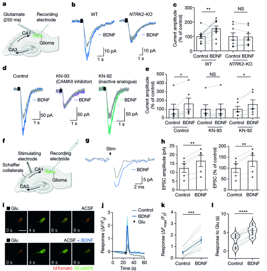 其次,作者利用全细胞膜片钳记录异种移植到海马细胞的电生理特性,河豚毒素能够阻断神经元的动作电位,AMPAR阻断剂NBQX可以阻断内向电流,而NMDAR抑制剂AP-5或谷氨酸转运蛋白抑制剂TBOA则不能。脑切片灌流BDNF增加了谷氨酸诱发电流的振幅,表明胶质瘤细胞TrkB活化介导谷氨酸诱发电流振幅变化。与异种移植的NTRK2野生型胶质瘤相比,NTRK2敲除可以阻止BDNF的谷氨酸诱发的内向电流振幅的增加细胞。BDNF通过CAMKII调节突触强度,而CAMKII抑制剂KN-93阻断BDNF的作用神经胶质瘤上谷氨酸能电流振幅大,而无活性类似物KN-92则没有,这些结果表明BDNF-TrkB信号通路调节神经胶质瘤细胞中谷氨酸诱发电流的强度。为了测试BDNF对神经元到胶质瘤突触电流的影响,轴突传入刺激神经胶质瘤细胞的海马CA1区,约10%的异种移植胶质瘤细胞中产生EPSCs, 暴露于BDNF后,胶质瘤EPSCs的振幅增加。作者进一步对异种移植的细胞进行钙成像,细胞特异性表达基因编码的钙指示剂GCaMP6s,局部使用谷氨酸诱导胶质瘤细胞钙活动改变。在两种不同的小儿胶质瘤模型中,BDNF暴露使谷氨酸诱发的钙活动增加。这一现象被AMPA受体阻断剂NBQX阻断。