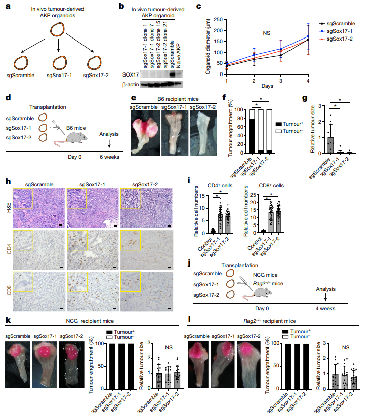 为了明确SOX17在结肠肿瘤发生中的作用,作者利用敲除体内肿瘤来源的AKP类器官中SOX17的表达。SOX17的缺失不影响它们在培养中的生长和增殖。当这些SOX17缺失的AKP类器官被移植到免疫正常小鼠的结肠中时,只有约6 %的受体发生肿瘤,并且肿瘤的大小也显著减小。对照AKP肿瘤浸润程度低,而少数存活的SOX17-null肿瘤表现为强烈的瘤内免疫细胞浸润。这些结果表明,SOX17在体内的表达可能在抑制抗肿瘤免疫反应中发挥重要作用。于是作者将SOX17缺失的AKP类器官移植到免疫缺陷的NCG小鼠或Rag2-/-小鼠体内。结果发现受体小鼠均发生肿瘤,与对照肿瘤相比,肿瘤大小无显著差异。证明SOX17通过免疫细胞促进肿瘤的建立和生长。