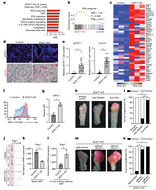作者对培养的对照和SOX17缺失的小鼠AKP类器官进行了RNA – seq,发现IFN γ应答基因集是SOX17缺失的AKP类器官在体外中上调的顶级通路之一。pSTAT1在SOX17缺失的肿瘤中显著高表达,表明在SOX17缺失的肿瘤细胞中对IFN γ的反应增强。在肿瘤细胞中增强的IFN γ信号通过增加趋化性和抗原呈递,导致活化的CD8+T细胞的募集。此外,IFN γ诱导的趋化因子Cxcl10,可以吸引CD8+T细胞,在SOX17缺失的肿瘤中富集。SOX17缺失的肿瘤中MHC - I的表达水平显著高于对照肿瘤。因此,SOX17缺失的结肠癌细胞能够对IFN γ产生强烈的反应,通过增加MHC - I和CXCL10的表达来增加其免疫原性和募集,从而促进其被CD8+T细胞排斥。因此,在体内肿瘤发生过程中,SOX17的诱导抑制了肿瘤细胞的感知和再生能力。为了研究SOX17在结肠癌细胞中抑制IFN γ信号的机制,作者对SOX17进行了靶向切割和使用核酸酶释放,发现SOX17直接与Ifngr1启动子结合。为了重现SOX17在类器官培养中的强诱导作用,作者在原始AKP类器官中引入了DOX诱导的组成型SOX17-OE构建体,发现SOX17-OE显著下调了中Ifngr1的表达,而SOX17缺失显著上调了其表达。SOX17直接抑制Ifngr1的表达,SOX17敲除的肿瘤表现出增强的IFN γ反应,IFN γ中和可以挽救SOX17缺失的肿瘤。作者推测在免疫健全的受体小鼠中SOX17缺失的肿瘤的排斥反应是由该通路的过度激活介导的。于是作者在SOX17敲除的AKP类器官中删除了IFNGR1,并将其原位移植到免疫正常小鼠体内。IFNGR1的缺失恢复了SOX17缺失的肿瘤细胞定植的能力。表明SOX17在体内诱导抑制了癌细胞中IFN γ信号级联中关键基因的表达,阻止了募集活化的IFN γ产生的效应样CD8+T细胞的前馈环路。这有效地阻止了抗肿瘤T细胞反应的形成,保护了这些结肠癌免受免疫清除。