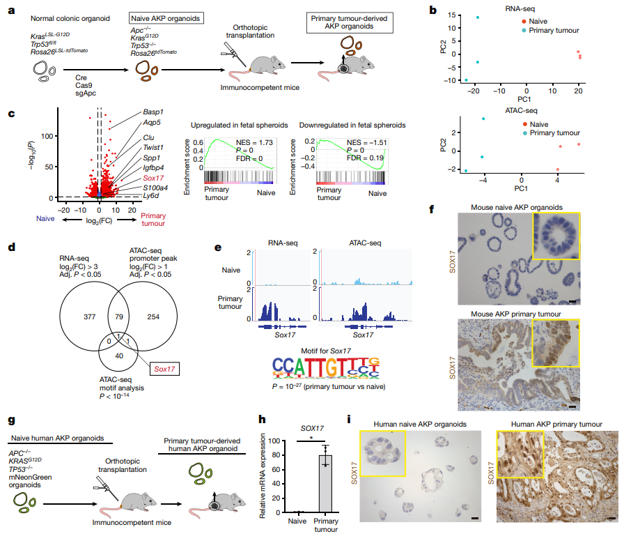 首先为了探究结直肠癌的转录组学和表观遗传学变化,作者通过CRISPR-Cas9等技术工程化改造健康小鼠结肠类器官使其表达癌症相关基因Kras、p53和APC的突变与tdTomato荧光,构建了原始AKP类器官。通过结肠镜将这些原始的AKP类器官原位移植到免疫健全的小鼠体内,从产生的原发性肿瘤中生成类器官。通过RNA测序和染色质分析技术检测( ATAC-seq )发现原发性肿瘤来源的AKP类器官表现出与原始AKP类器官明显不同的转录组和染色质可及性变化,具有不同的基因表达模式。这些结果表明作者在体内结肠环境中诱导了CRC来源的初级类器官中稳定的、可遗传的表观遗传学改变。为了鉴定调控这些改变的转录因子,作者整合并比较了RNA-seq DGE和ATAC – seq染色质测序开放启动子峰和基序富集分析,筛选出了SOX17这个内胚层和前肠发育所必需的转录因子。