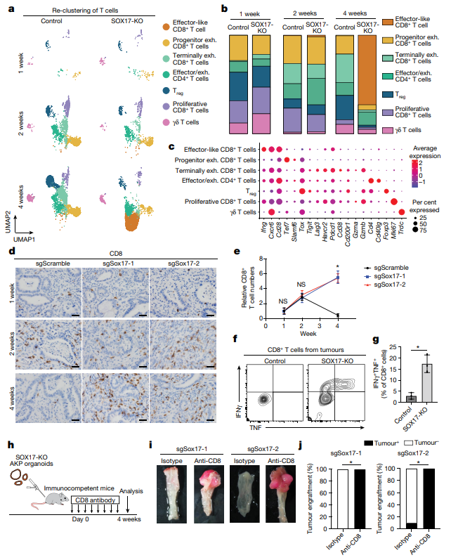 为了研究肿瘤细胞中的SOX17如何控制肿瘤相关免疫微环境的进化,作者在移植sox17敲低AKP类器官后后1,2和4周收集的免疫正常受体的SOX17-null肿瘤和对照的流式分选的CD45+细胞上进行了单细胞RNA – seq。对T细胞重新聚类,在对照肿瘤中,终末期耗尽的CD8+T细胞构成了第4周的CD8+T细胞的主要人群。而具有较强抗肿瘤杀伤能力的效应性CD8+T细胞成为中数量最多的。相反,这种细胞毒性群体仅在对照肿瘤稀疏检测到,与CRCs的免疫抑制环境一致。流式细胞术分析证实,与对照肿瘤相比,SOX17缺失肿瘤中CD8+T细胞产生IFN γ和TNF的能力显著增强。于是作者研究了CD8+和CD4+T细胞在介导SOX17在肿瘤中的作用。在移植sox17敲低AKP类器官后,分别用抗CD8和CD4抗体处理,CD8+T细胞耗竭使所有SOX17缺失的肿瘤生长,表明免疫正常小鼠中SOX17缺失的肿瘤被CD8+T细胞清除。与缺乏CD8+T细胞的小鼠相比,CD4+T细胞缺失小鼠的肿瘤体积明显较小。这些数据表明SOX17缺失的肿瘤中TH1细胞可能支持抗肿瘤CD8+T细胞介导的反应。以上数据表明效应性CD8+T细胞促进了对SOX17缺失肿瘤的排斥反应,而CD4+T效应性TH1细胞在维持和增强CD8+T细胞反应中具有重要作用。