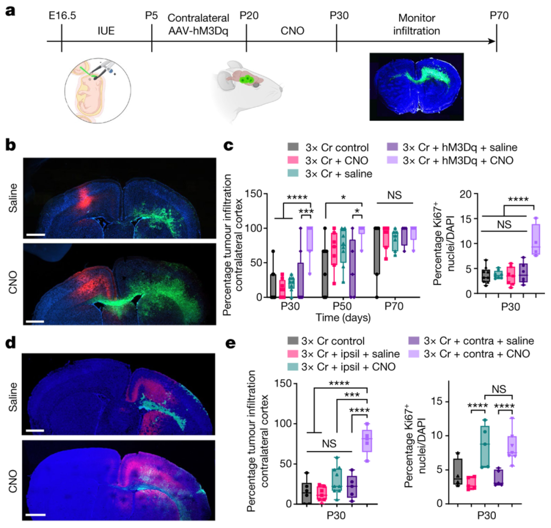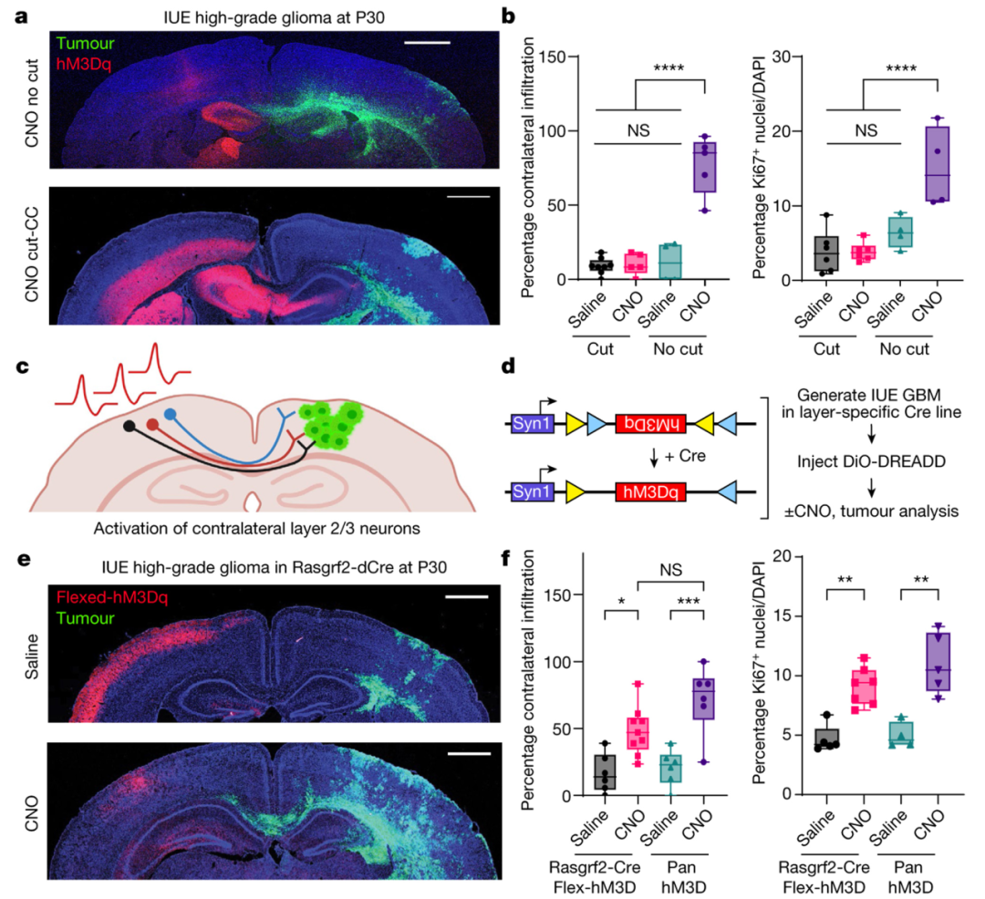 首先,为了研究神经元的远程刺激是否会促进低级别胶质瘤(LGG)向高级别胶质瘤(HGG)转化,作者使用了基于RCAS/Ntva系统的LGG小鼠模型,在小鼠龄第5天时在对侧皮层注射化学遗传学病毒,使神经元特异性表达hM3Dq,第20天小鼠给予氯氮平N-氧化物(CNO)并持续2个月以激活对侧皮层神经元。结果显示CNO处理的小鼠中位总生存期明显减少,Ki67表达增加,表明远离原发性LGG区域的神经元活性增强可以促进HGG的进展。在基于CRISPR-Cas9的子宫电穿孔(IUE)模型中,观察到激活远离原发肿瘤大脑区域的神经元促进了肿瘤通过胼胝体向对侧半球的浸润。