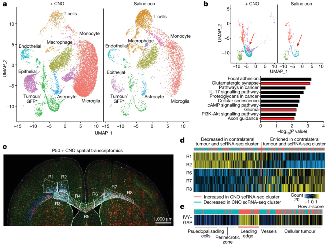 然后,作者对在对侧神经元激活时的P50神经胶质瘤进行单细胞RNA测序(scRNA-seq)分析,并使用绿色荧光蛋白(GFP)标记肿瘤细胞,以区分宿主微环境群体和肿瘤群体。结果显示,在神经元活性增强时,免疫微环境发生了广泛的变化,肿瘤细胞成分也发生了变化。结合空间转录组学分析,发现该神经元刺激驱动了位于原发肿瘤对侧的浸润性肿瘤细胞的产生,同时这些细胞群中富含与轴突引导相关的基因。