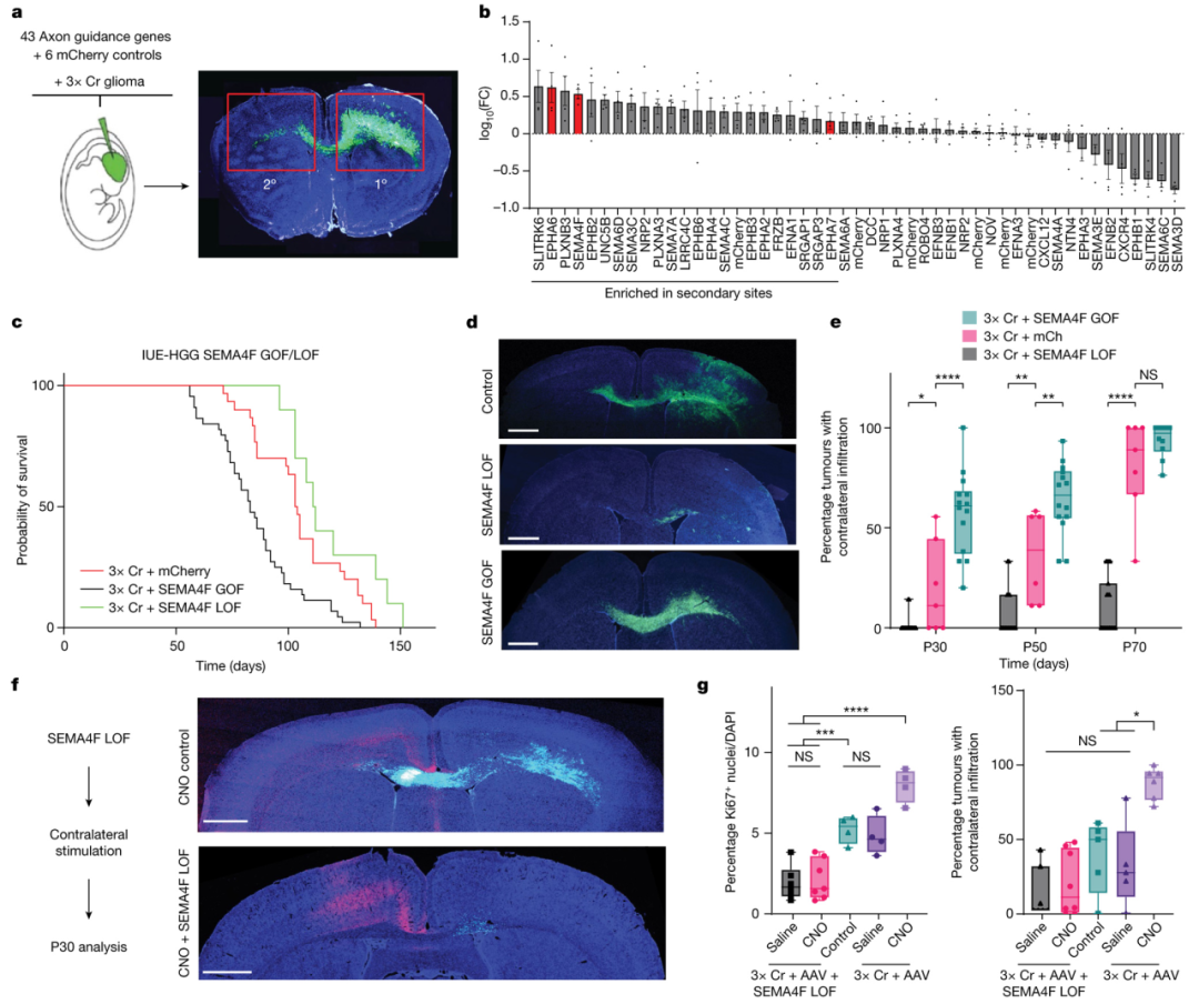 作者进一步研究了上述轴突引导的基因在浸润性胶质瘤群体中的作用,通过生成基于Piggybac的43个轴突引导基因条形码文库进行过表达筛选,结合barcode测序分析和IVY-GAP数据库评估,最终确定Semaphorin-4F (SEMA4F)是神经胶质瘤发展的关键调节因子。通过IUE-HGG模型结合基于CRISPR-Cas9的功能缺失型突变(LOF)和功能获得型突变(GOF)实验确定SEMA4F在胶质瘤发生和浸润中的作用。