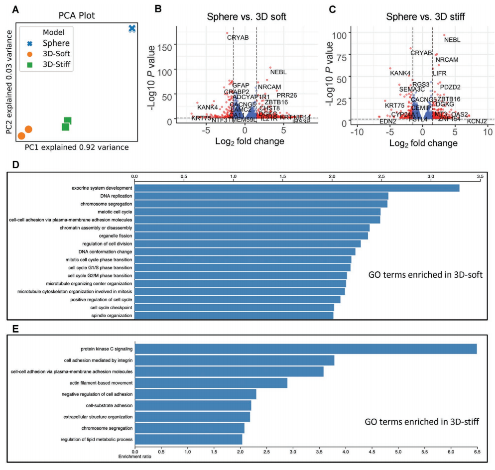 主成分分析显示,球状体培养与任何一种3D培养相比都有截然不同的转录谱,而两种3D培养之间的差异程度较小(图2A)。一些蛋白编码的癌症相关基因或预后基因在两种3D培养条件下都上调了16倍以上(图2B,C)。与球状体相比,与 DNA复制、细胞周期调控和细胞分裂的通路在3D软质模型中明显富集(图2D)。