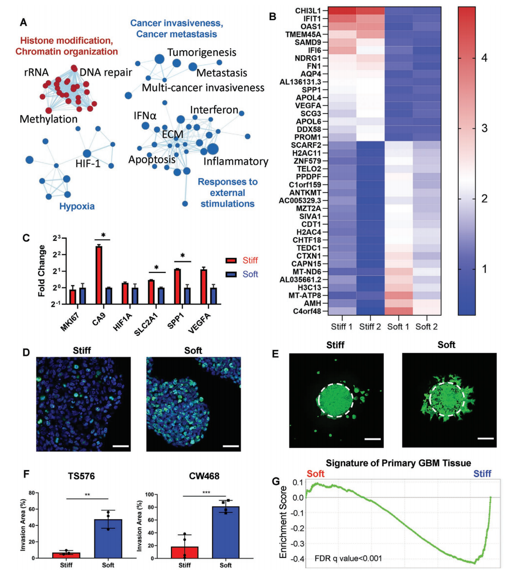 TS576细胞和CW468细胞在软质模型中的侵袭面积分别是硬质模型的7倍和4.4倍(图3F)。与从软质模型中分离出的TS576细胞相比,从硬质模型中分离出的TS576细胞高度富含原发性GBM组织特征(图3G),表明硬质模型将细胞转化为更具有临床意义的状态。