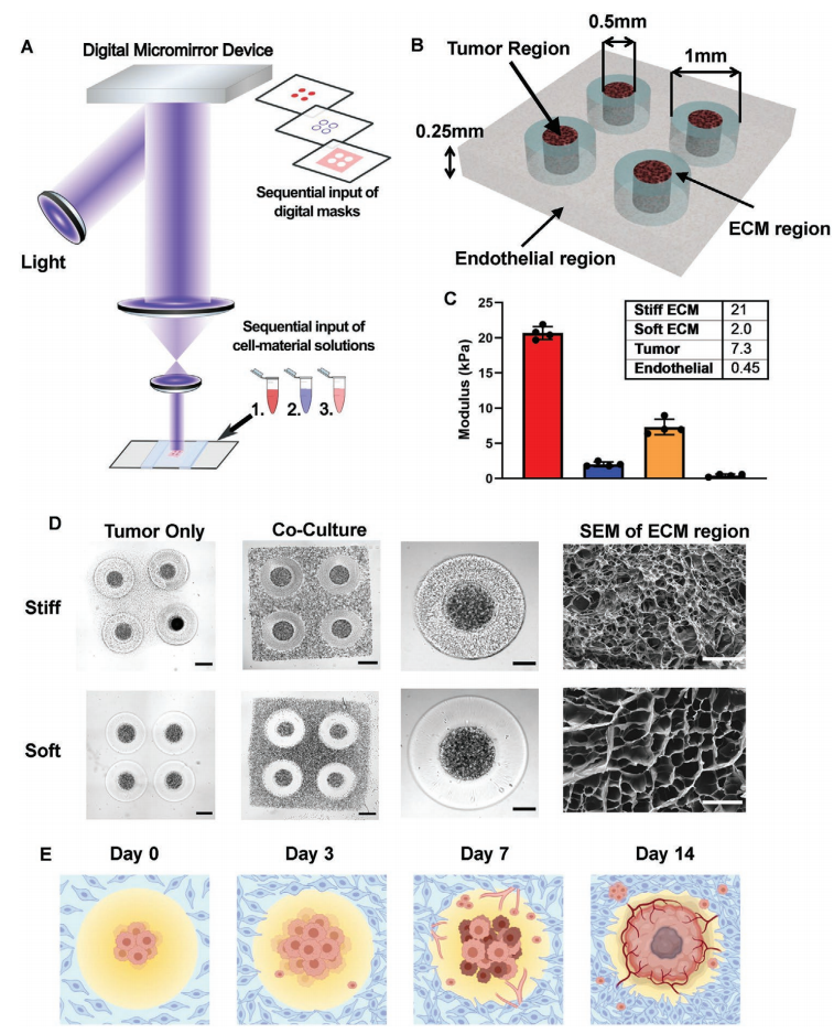 胶质母细胞瘤(GBM)是最致命的原发性脑肿瘤,其特点是细胞和分子的高度异质性,血管过密,以及先天的耐药。细胞成分和细胞外基质(ECM)是GBM中异质性的两个主要来源。本文中,来自加州大学圣地亚哥分校的Tariq M. Rana和Shaochen Chen团队的Min Tang等作者开发了具有肿瘤区域、无细胞ECM区域和内皮区域的仿生物三区GBM模型,其区域硬度与GBM基质、病理或正常脑实质和脑毛细血管相对应。DLP光固化生物3D打印技术的灵活性和多样化的材料选择允许对肿瘤模型的生物物理特性和生化特性进行正交调制。