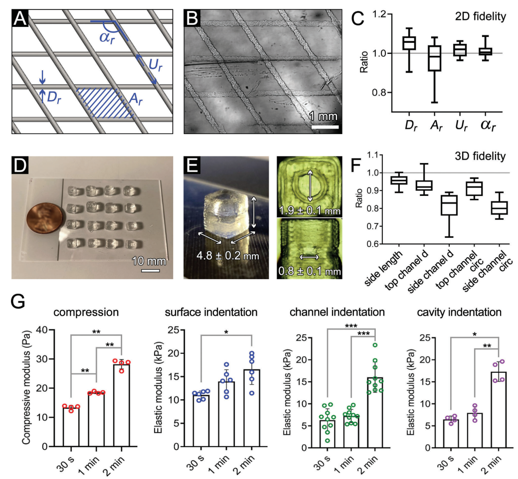 图2. 打印保真度和生物打印的GelMA模型的机械性能特征