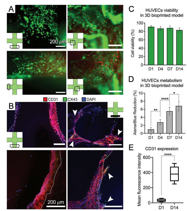 HUVECs在3D结构的不同区域表现出高水平的活力(图4A-C)。AlamarBlue在培养期间持续减少,这表明生物图谱内的HUVECs的活力/增殖增加(图4D)。IHC分析表明,在第14天,GelMA结构的打印通道和中心腔成功实现了内皮化,HUVECs表达CD31和CX43(图4B)。HUVECs从通道的管腔表面渗入到GelMA基质中(图4B),进一步证实了GelMA能保持EC功能的生物活性。CD31的表达水平在第14天明显增加,表明在GelMA生物打印中,ECs的持续增长和细胞功能的增强(图4E)。