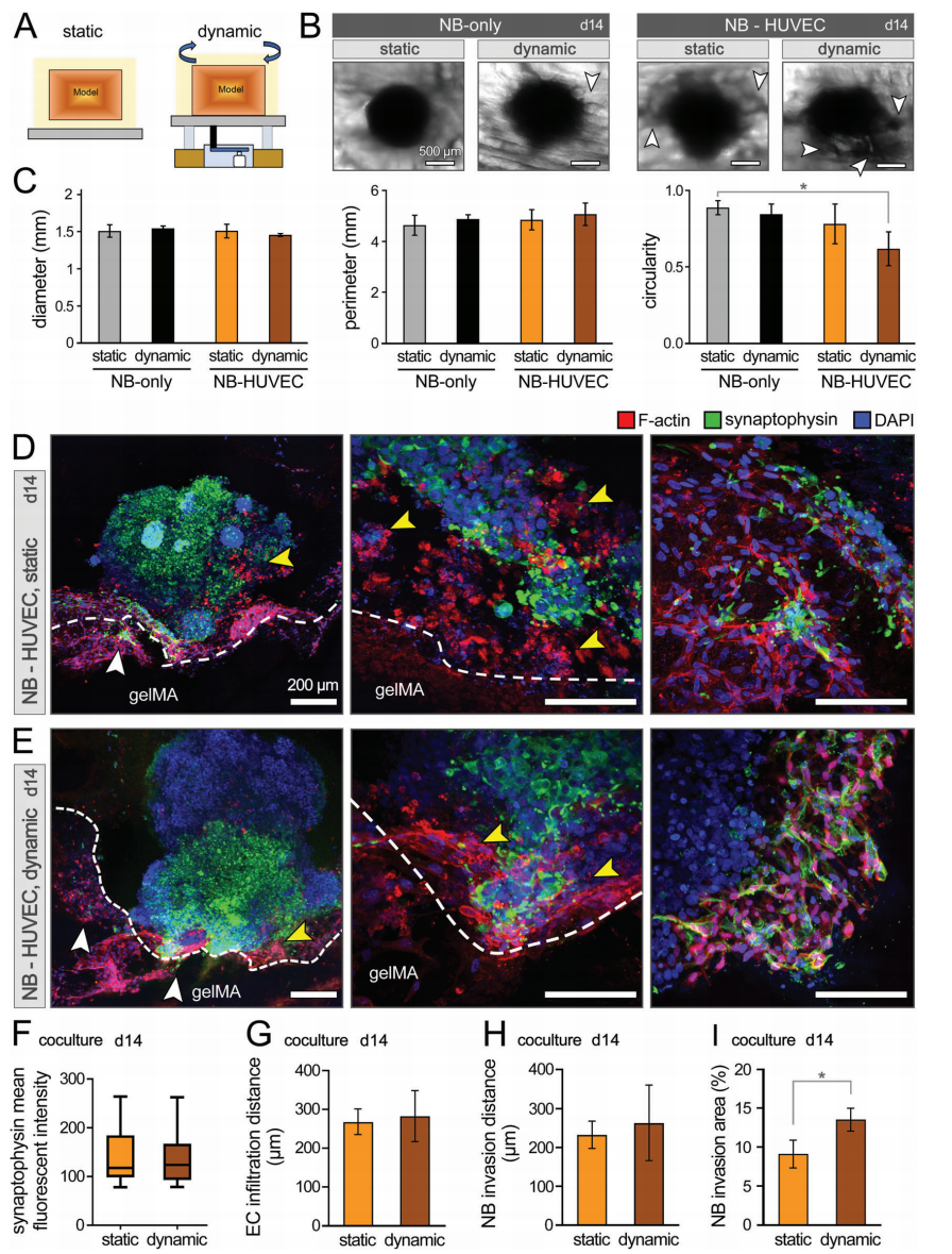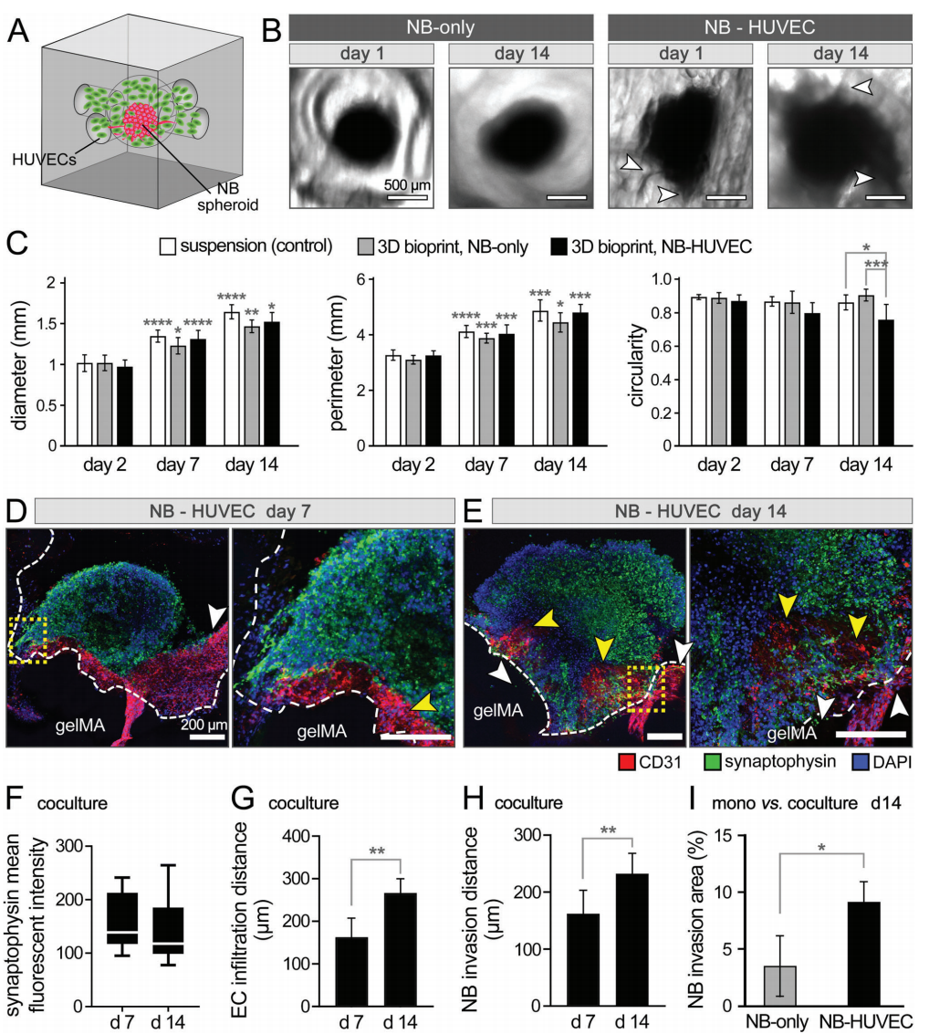 静态培养的NB-EC模型中球状体直径和周长持续增加,这与在培养基(对照组)或在没有HUVECs(纯NB,图5B)的结构中培养的球状体没有明显区别。考虑到三组中使用了一致的培养基成分,可以得出结论,ECs的加入并没有阻止NB的生长,但可能将球状体变成不对称的形状(图5B)。IHC分析证实,与单独培养的NB相比,生物打印共培养的NB细胞的迁移性和侵袭性更强(图3D-F)。共培养的NB在NB特异性突触蛋白的表达上没有明显的差异,这表明ECs没有引起负面影响(图5F)。NB细胞与HUVECs的共培养也明显增加了癌细胞对GelMA基质的侵袭程度(图5I)。
